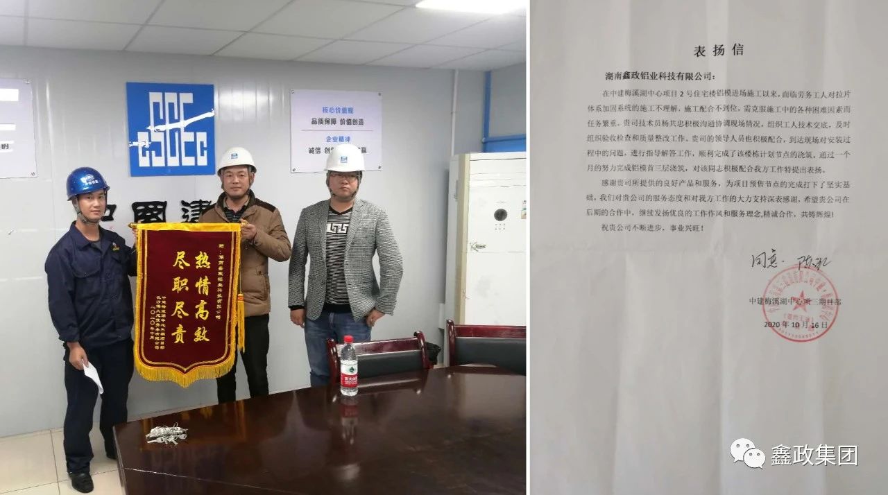 瀏覽次數:1196近日,中建五局第三建設有限公司中建梅溪湖中心項目部和現場勞務公司長沙博大建筑勞務有限公司送來錦旗和表揚信,對鑫政鋁業技術服務科楊共忠在項目上的出色表現給予了充分肯定和高度評價。_20250530091630A310.jpg)